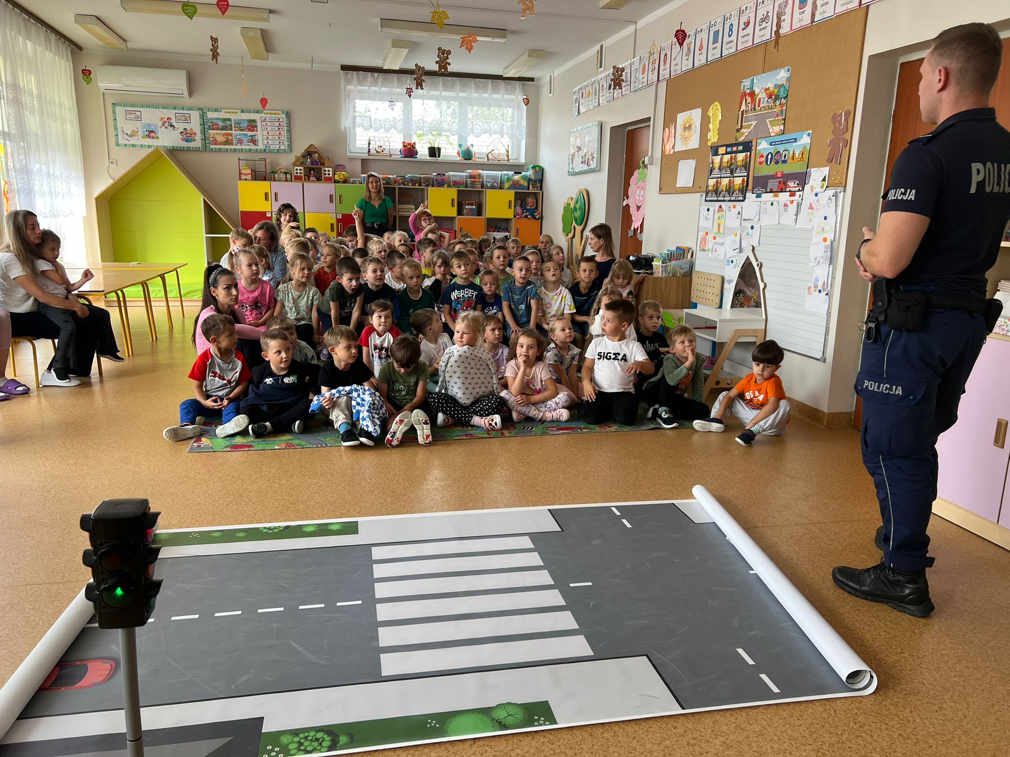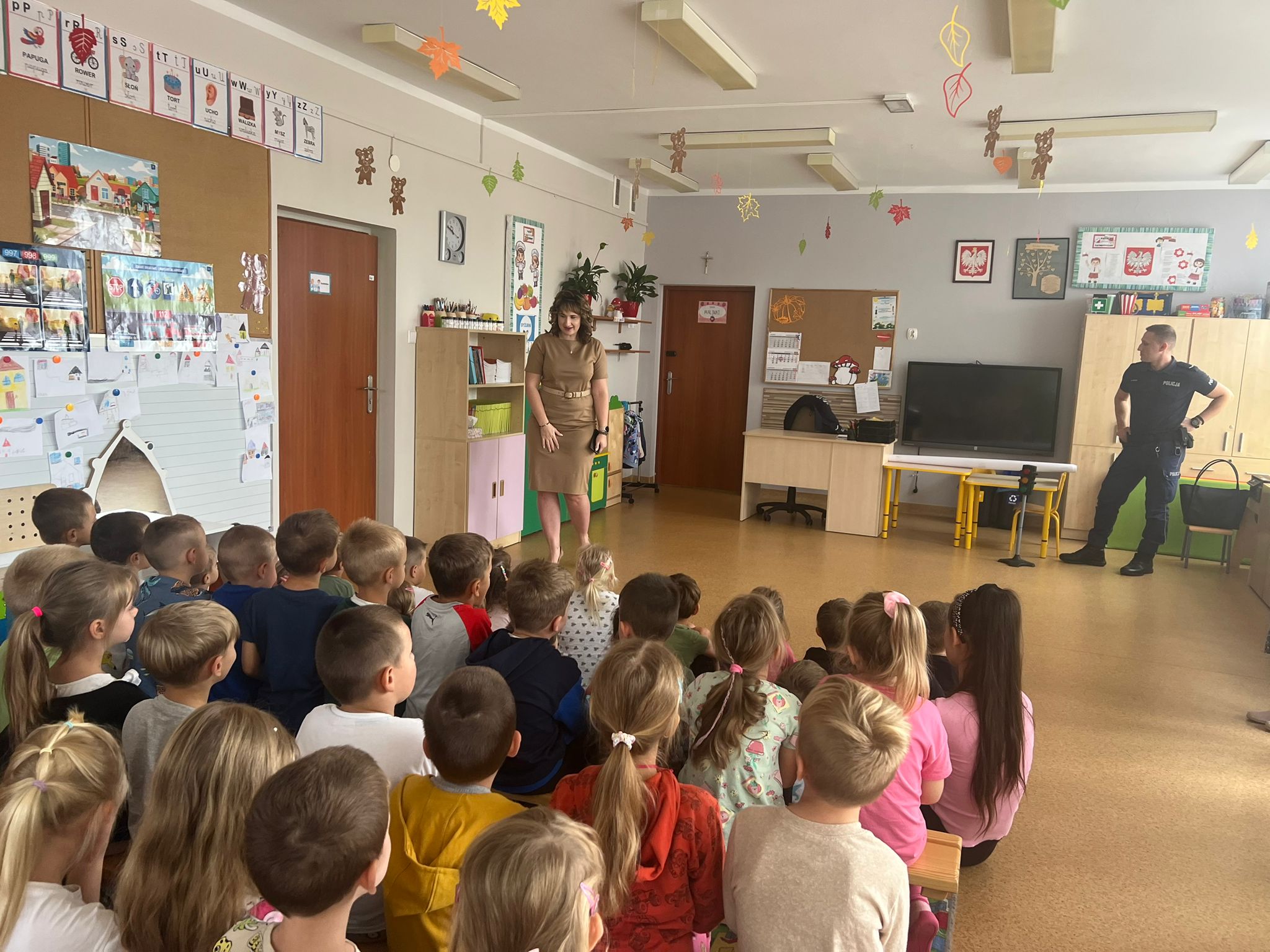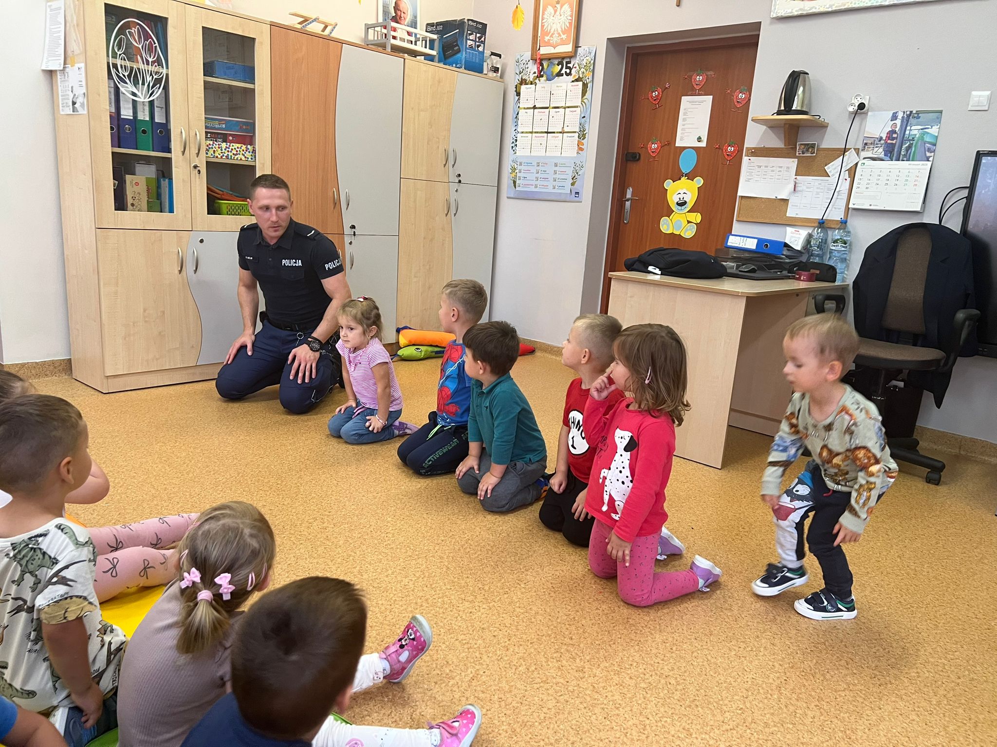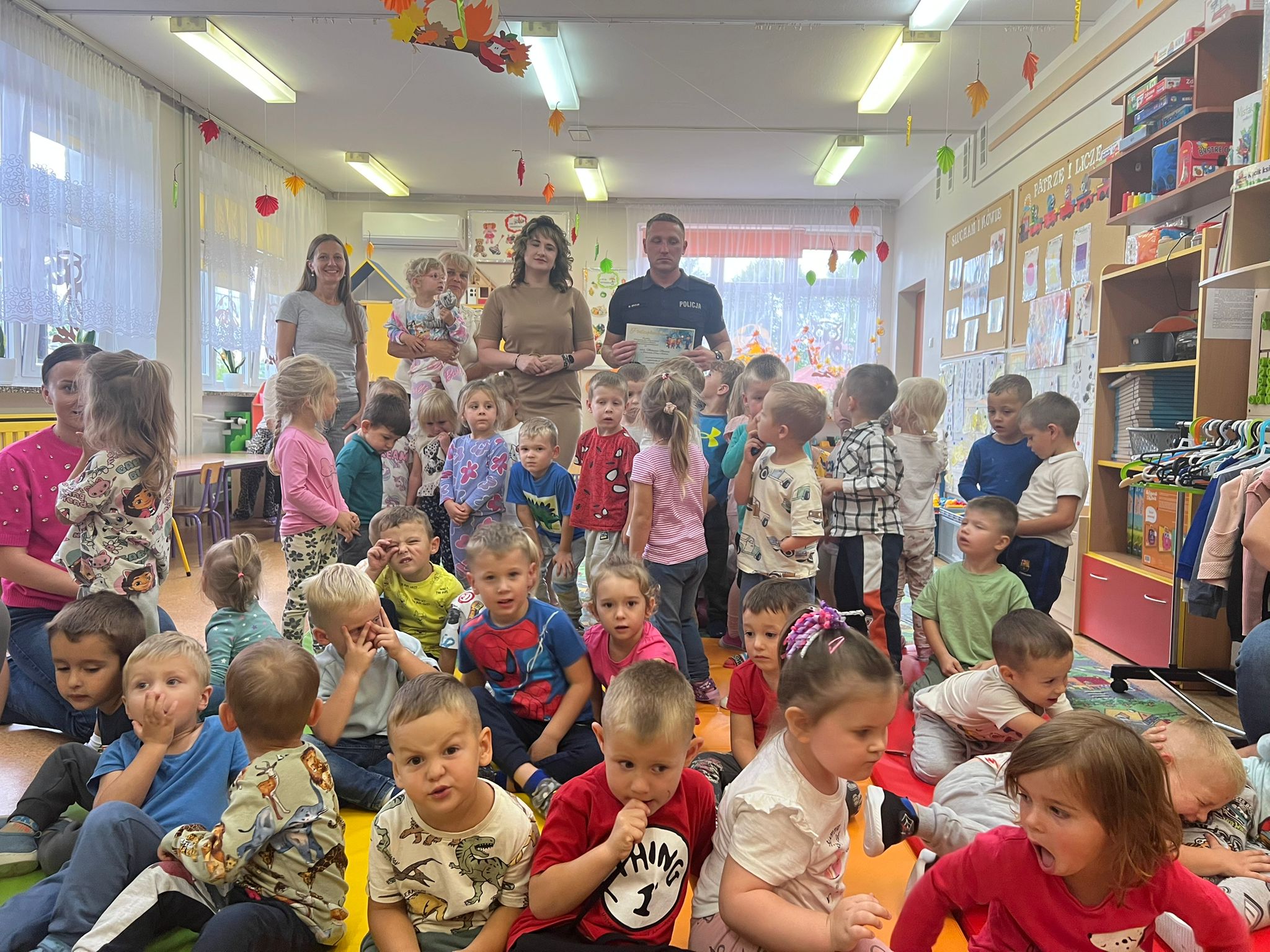 W naszym przedszkolu odbyło się wyjątkowe spotkanie z Panem Mateuszem – policjantem z Posterunku Policji w Grębowie. Tematem przewodnim była bezpieczna droga do przedszkola oraz zasady, które każdy mały przedszkolak powinien znać, aby czuć się bezpiecznie. Podczas spotkania Pan Mateusz przybliżył dzieciom swoją codzienną pracę.Przedszkolaki z ogromnym zainteresowaniem oglądały policyjne wyposażenie, zadawały wiele pytań i chętnie dzieliły się swoimi spostrzeżeniami.