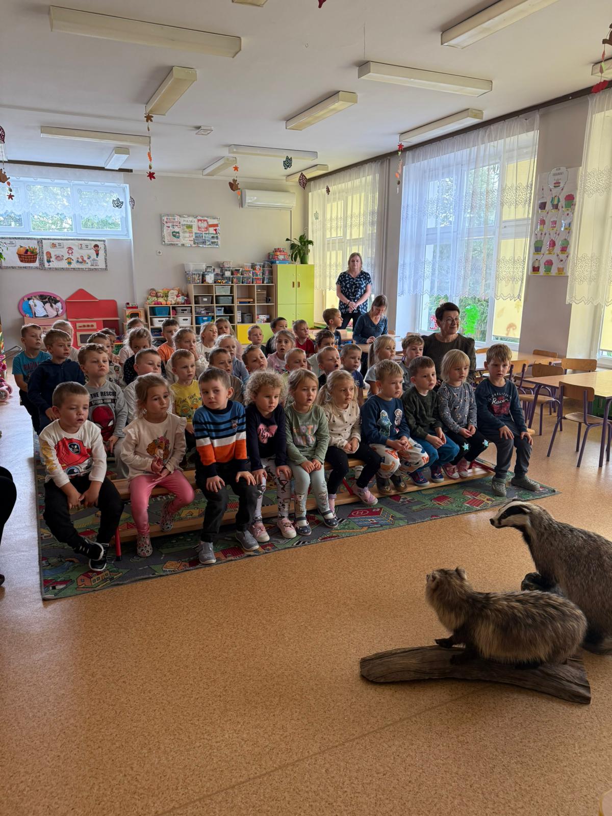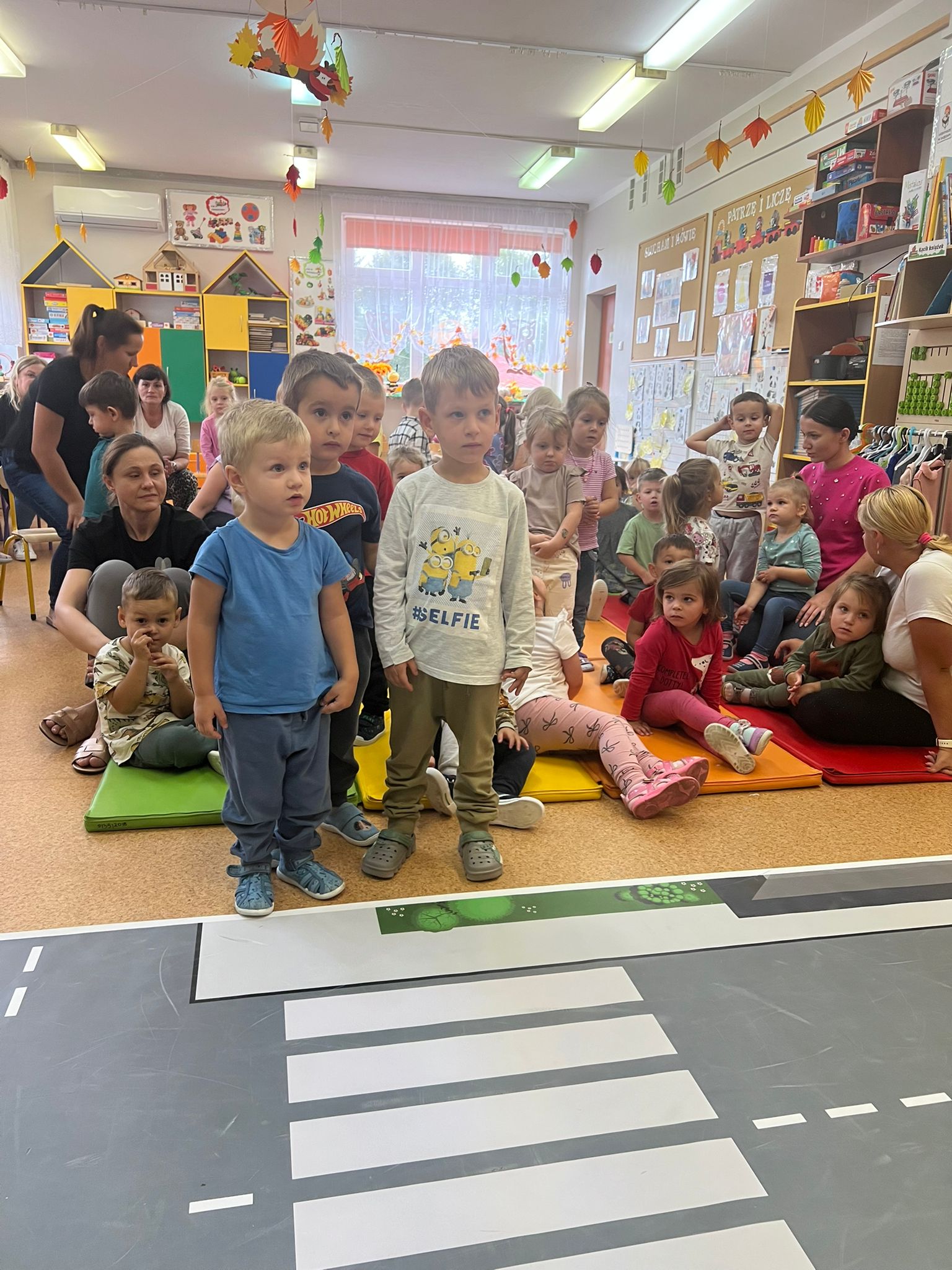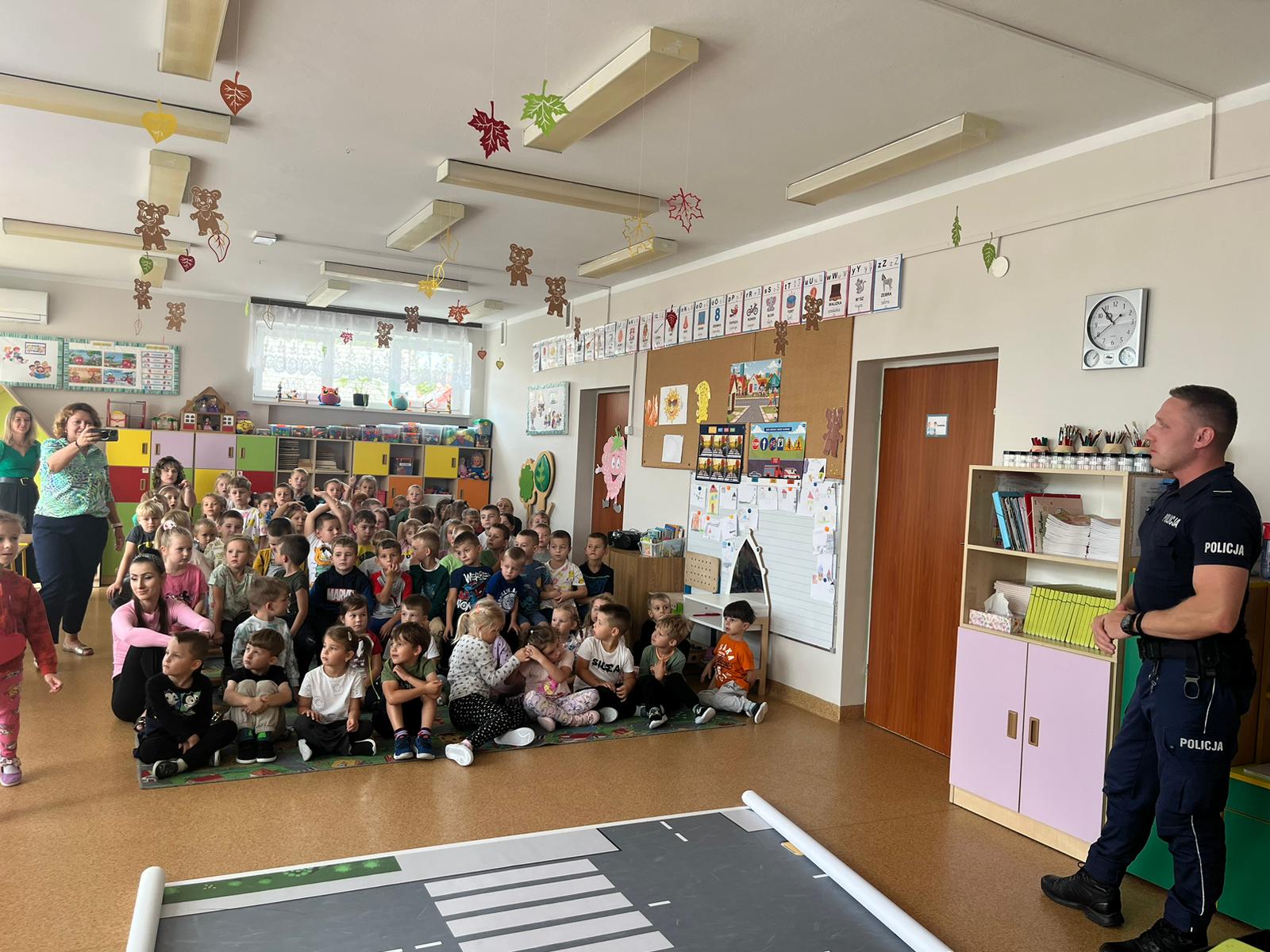 W naszym przedszkolu odbyło się wyjątkowe spotkanie z Panem Mateuszem – policjantem z Posterunku Policji w Grębowie. Tematem przewodnim była bezpieczna droga do przedszkola oraz zasady, które każdy mały przedszkolak powinien znać, aby czuć się bezpiecznie. Podczas spotkania Pan Mateusz przybliżył dzieciom swoją codzienną pracę.Przedszkolaki z ogromnym zainteresowaniem oglądały policyjne wyposażenie, zadawały wiele pytań i chętnie dzieliły się swoimi spostrzeżeniami.